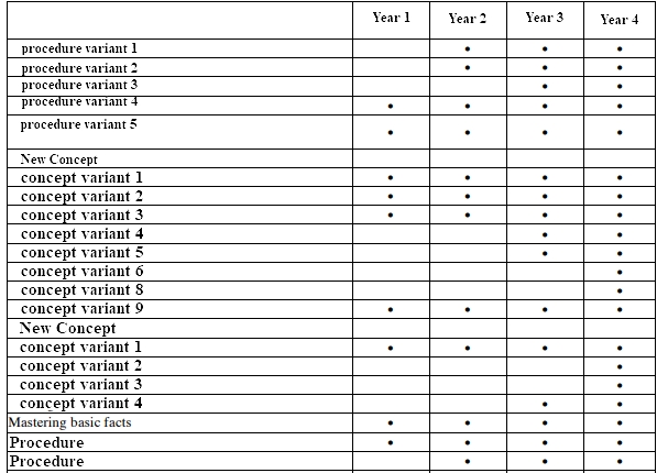 A scope and sequence is chart of what and when specific items are covered in a curriculum. Like this:
