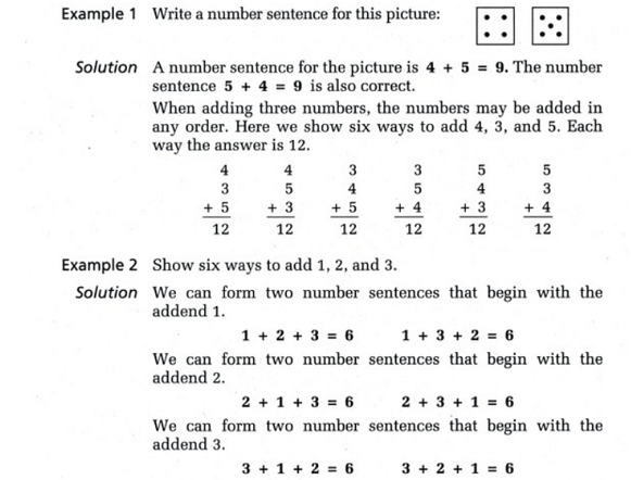 This is the first day of 5/4, meant for bright 4th graders or average 5th graders. Note how the goal is called out on the left. Vocabulary is clearly defined. Visual illustrations are provided. No assumption is made about whether students have learned the concept of addition. Properties are identified, and multiple worked examples are provided.